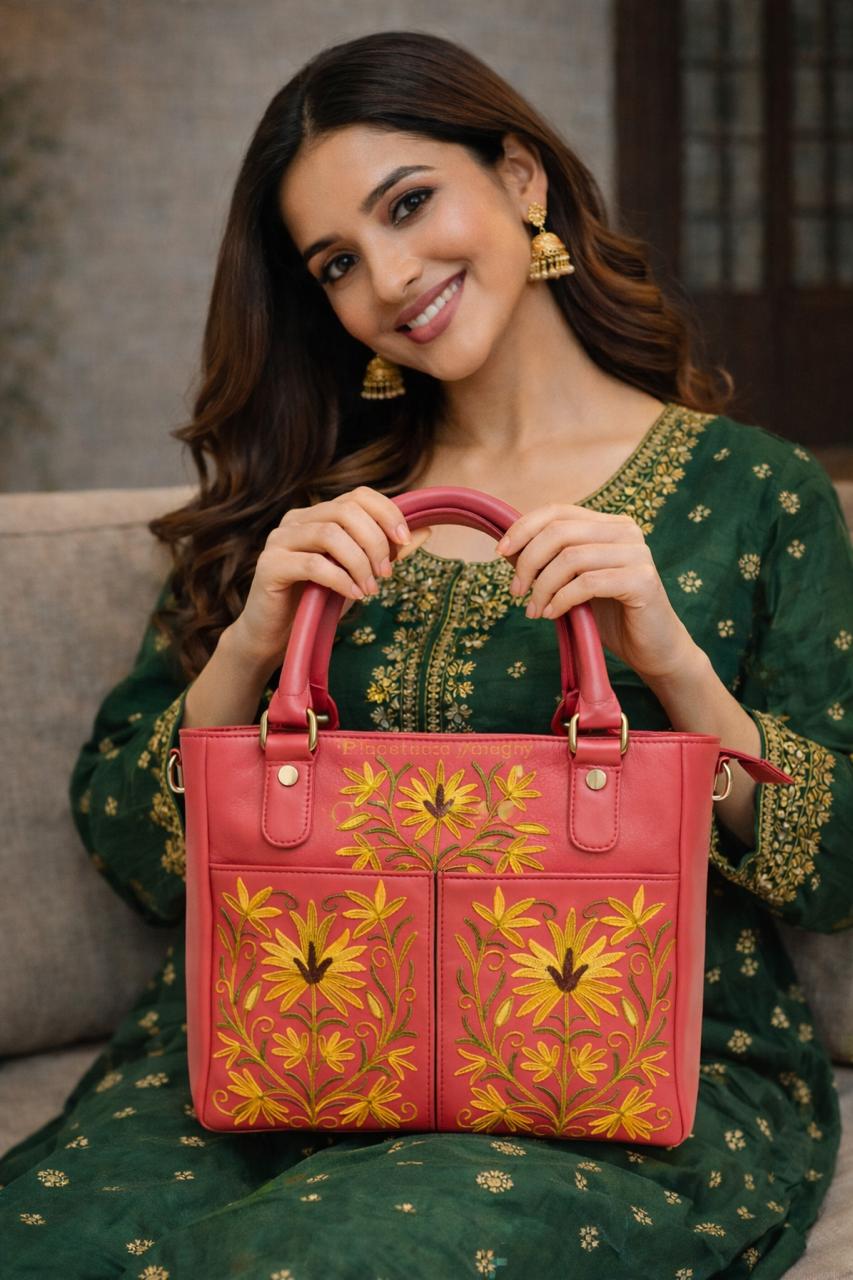 This exquisite Kashmiri handcrafted leather bag showcases the finest tradition of artisanal craftsmanship. Meticulously created by skilled artisans in Kashmir, the bag is made from premium-quality leather and adorned with intricate hand-embroidered floral motifs that reflect the rich artistic heritage of the region.